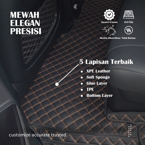 Karpet Mobil Premium Carmats terbuat dari 5 lapisan karpet terbaik dengan ketebalan 1.2 cm yaitu XPE Leather, Soft Sponge, Glue Layer, TPE, Sponge, dan Bottom Layer.